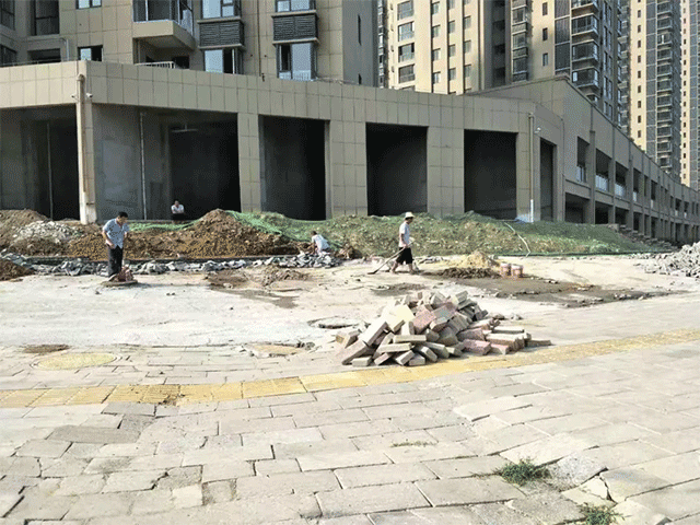 2#地塊小區院內環路瀝青鋪完,16#樓門前鋪磚完成,15#樓商鋪門前砌踏步臺階準備鋪磚。3#地塊17#樓商鋪門前鋪磚;