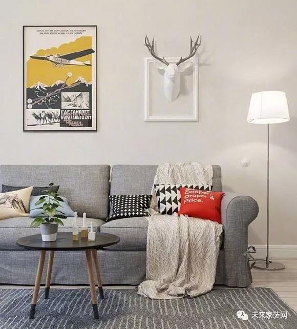 灰色的地毯,搭配灰色的布藝沙發,簡潔而素雅的配色設計極具北歐風慵懶舒適的特點,再配上一張簡易的圓形黑小茶幾,愜意的家居生活讓幸福感倍增。沙發的角落里配上一盞落地燈,后方的墻面利用裝飾畫和掛件來點綴,溫馨舒適的家居生活來自于對每件軟裝飾品的精心挑選。